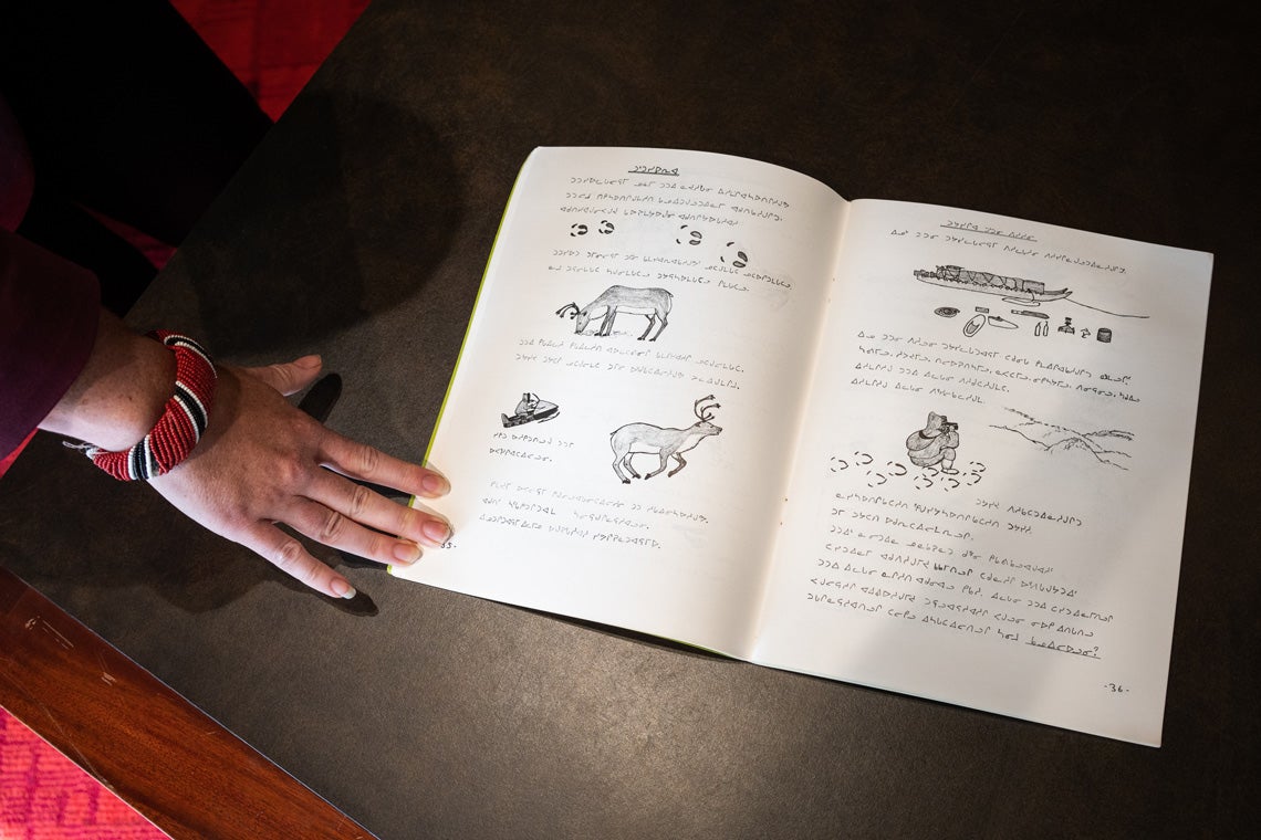 An illustrated Inuktitut textbook from the 1970s teaches students to hunt (photo by Geoffrey Vendeville)