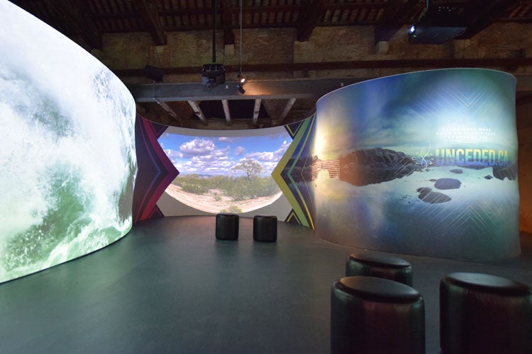 The Unceded exhibition consists of curved walls with projected images, allowing Indigenous architects to tell their stories in their own words (photo by Cueyo Laux)