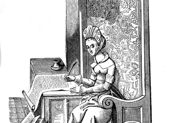 Christine de Pizan in a 19th-century version of a 15th-century manuscript illustration (photo via The Print Collector/Getty Images)