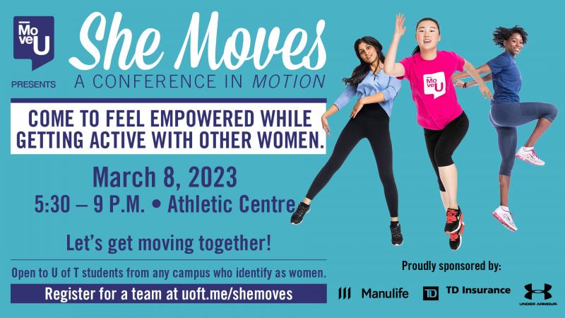 The Faculty of Kinesiology & Physical Education is inviting all women-identifying students to participate in MoveU, an evening of physical activity, wellness and discussion. The event takes place on March 8 from 5:30 to 9 p.m. at the Athletic Centre on the St. George campus.
