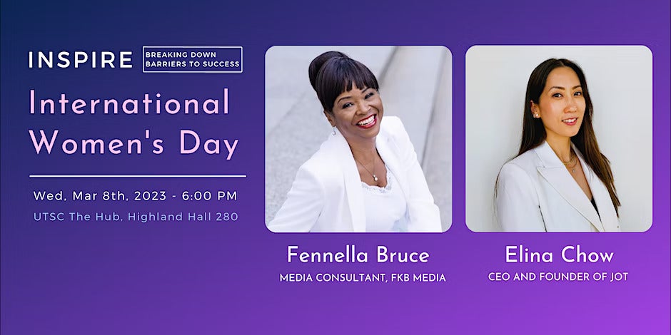 Part of U of T’s Entrepreneurship Week, there will be a discussion with U of T Scarborough alumna Fennella Bruce, veteran television producer and host and media consultant, and Elina Chow, CEO of JotTech. The event takes place on March 8 from 6 to 8 p.m. at The Hub in Highland Hall.