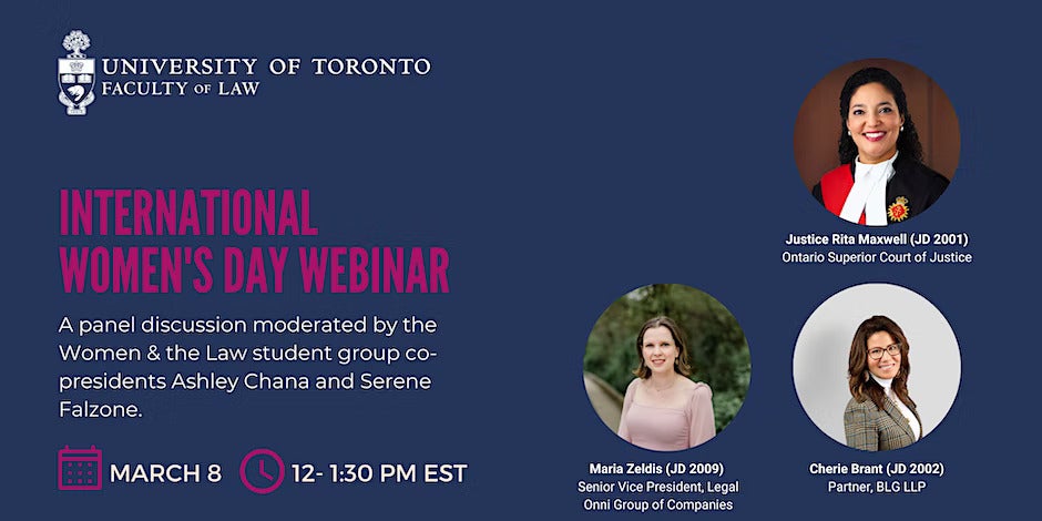 The Faculty of Law is hosting a panel discussion moderated by the Women and Law student group on March 8 from 12 to 1:30 p.m. The event features U of T alumnae Cherie Brant, national leader for the Indigenous law group at Borden Ladner Gervais, Rita Maxwell, a judge on the Ontario Superior Court of Justice, and Maria Zeldis, senior vice president legal at Onni Group of Companies.