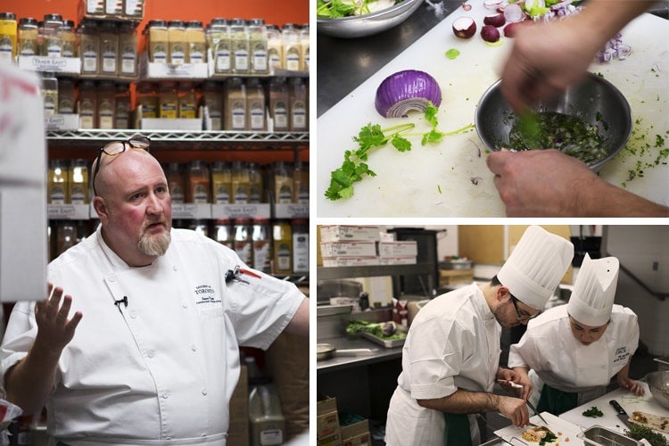 From left, Chef James Piggott shows the students the store room, Jordan Su makes a sauce for the appetizer (top right), Felipie Branco and Brettany Colette (bottom right) plate the main course (photos by Geoffrey Vendevlile)