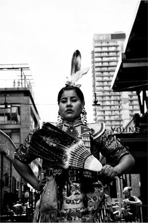 In a photo, Tee Duke stands in an alley in Toronto’s downtown core. She holds a fan of feathers against her chest, partly covering the beaded regalia she wears to honour the jingle dress dance, which traces its origins back to her childhood home in Treaty 3 territory near Kenora, Ont.