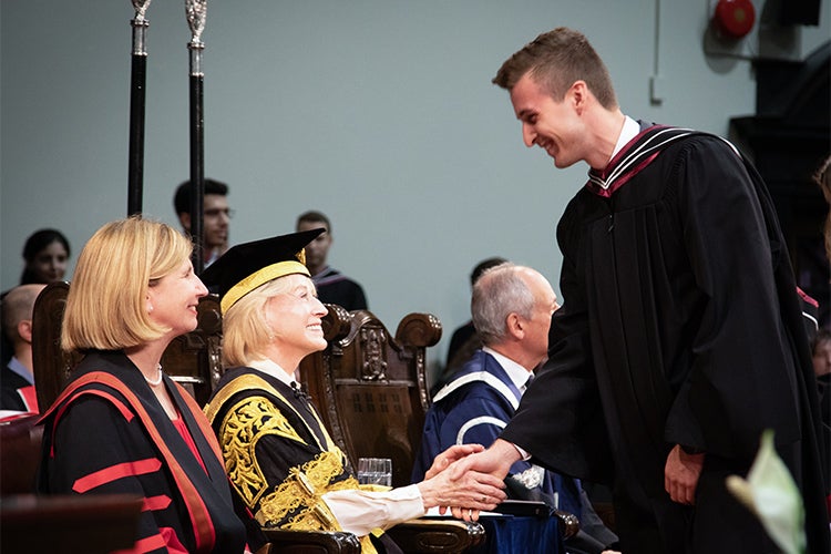 U of T Chancellor Rose Patten shakes the hand of a graduating student during a ceremony in Convocation Hall.