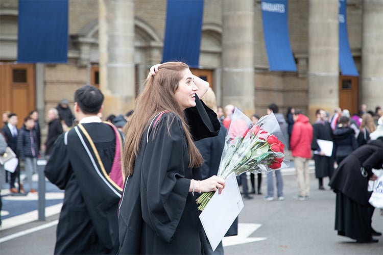 After years of studying, it's finally here! A graduate walks in front of Convocation Hall with flowers in hand.