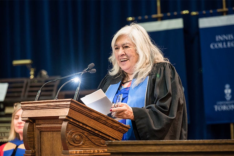 Lee Maracle, a critically acclaimed Sto:lo author and instructor in Indigenous Studies and at U of T’s First Nations House, addresses graduating students in Convocation Hall. Maracle was part of an all-female lineup of convocation speakers.