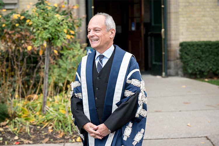 Wearing his blue and white robe, U of T President Meric Gertler makes his way to Convocation Hall.
