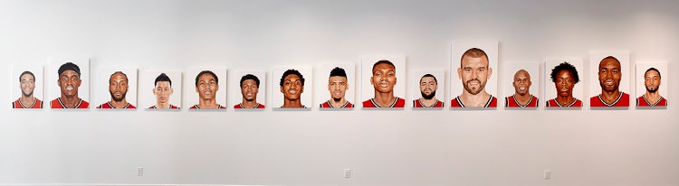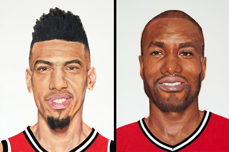 In her exhibition Organizing Principle, displayed at the Nicholas Metivier Gallery in April, Joanne Tod painted portraits of every member of the Raptors. The paintings (pictured below) were produced on canvases of varying sizes, depending on the relative height of each player.