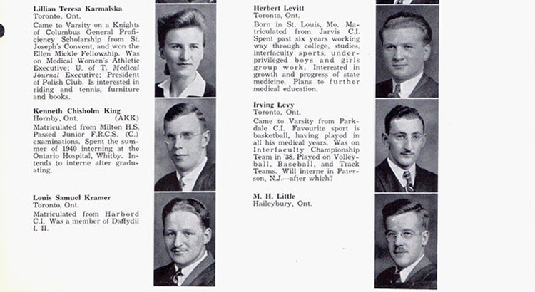 In the student yearbook, Lome is pictured on a page (above) with all men in the medical program. Her entry notes that she was on the executive of the Medical Women’s Athletic Club and the U of T Medical Journal, as well as president of the campus Polish club.