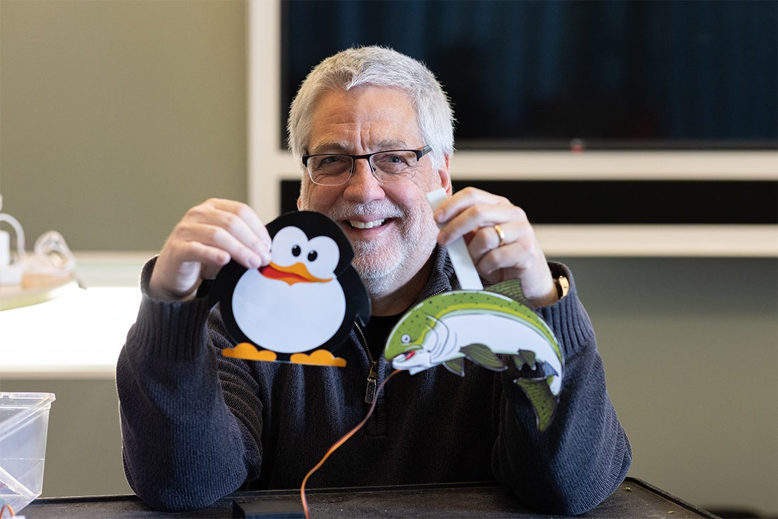 Paul Dietz, a distinguished engineer in residence and director of fabrication in U of T’s computer science department, hopes his paper animatronic creations can engage more kids in STEM through the power of storytelling (photo by Polina Teif)