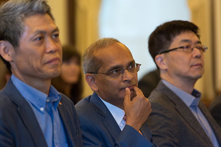 Vivek Goel, U of T's vice-president of research and innovation, is flanked by I.P. Park, the president and CTO of LG Electronics (right), and Peter Kim (left), senior vice-president, artificial intelligence (photo by Geoffrey Vendeville)