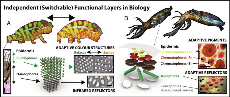 Biological inspiration for fluidic multilayer: (A) Colour change in the panther chameleon is achieved using a multilayer architecture of active photonic crystals; (B) Colour change in the squid is achieved using co-ordinated actuations within a multilayer of pigmentary and structural elements.