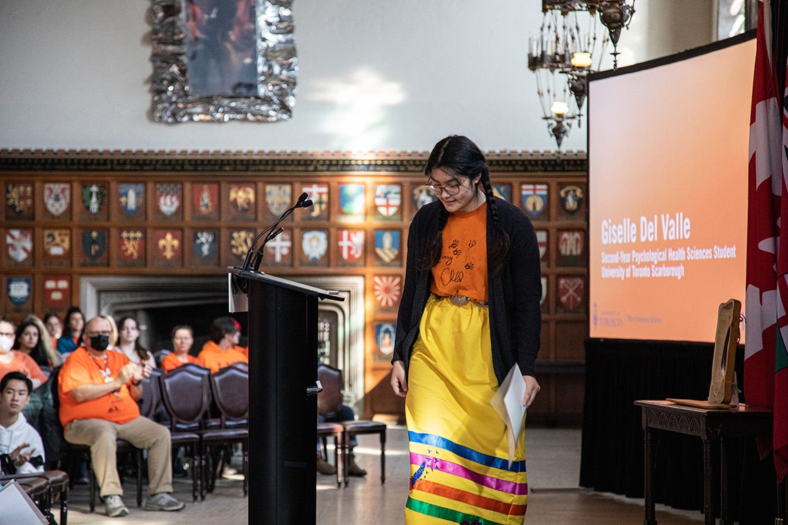 Giselle Del Valle, a second-year psychological health sciences student at U of T Scarborough, introduced keynote speaker Brenda Wastasecoot (photo by Polina Teif)