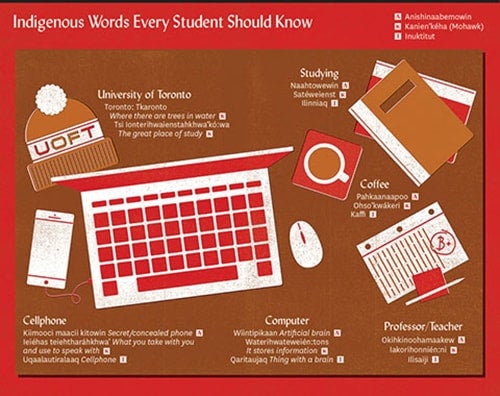 Rice was a member of the steering committee that produced U of T’s Truth and Reconciliation report, released in January. The report contains three calls to action involving Indigenous languages, including naming spaces on U of T’s campuses using Indigenous languages. Rice says that much like making a statement of land acknowledgement (Toronto sits on Anishinaabe territory) or replacing “thank you” with “miigwetch,” giving university spaces an Indigenous name could help familiarize many people with the language.