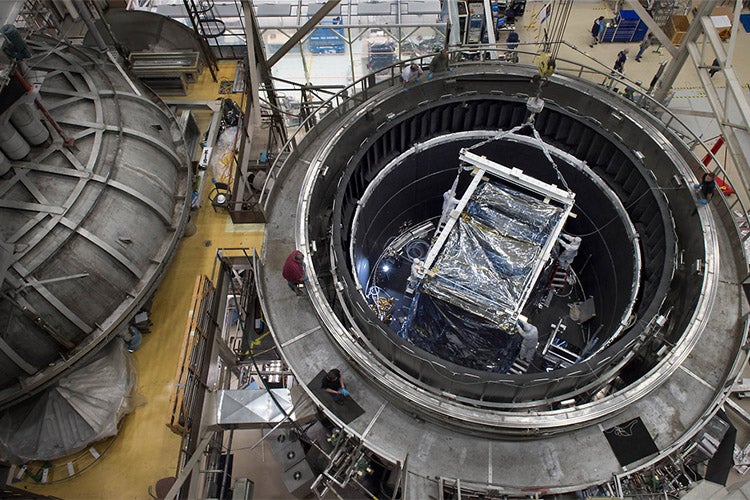 A module from the James Webb Space Telescope emerges from Goddard’s Space Environment Simulator after 116 days of exposure to a vacuum and frigid temperatures (photo by NASA Goddard/Chris Gunn)