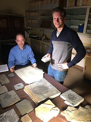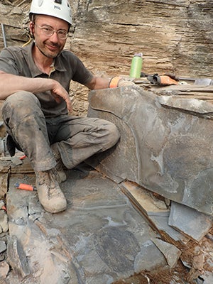 Jean-Bernard Caron sits above a fossil of Titanokorys gainesi at the quarry site located in Kootenay National Park (ohoto by Joe Moysiuk)“The sheer size of this animal is absolutely mind-boggling – this is one of the biggest animals from the Cambrian period ever found,” says Jean-Bernard Caron, an associate professor in the departments of Earth sciences and ecology and evolutionary biology (EEB) in the Faculty of Arts & Science at U of T and the Richard M. Ivey Curator of Invertebrate Palaeontology at the ROM.