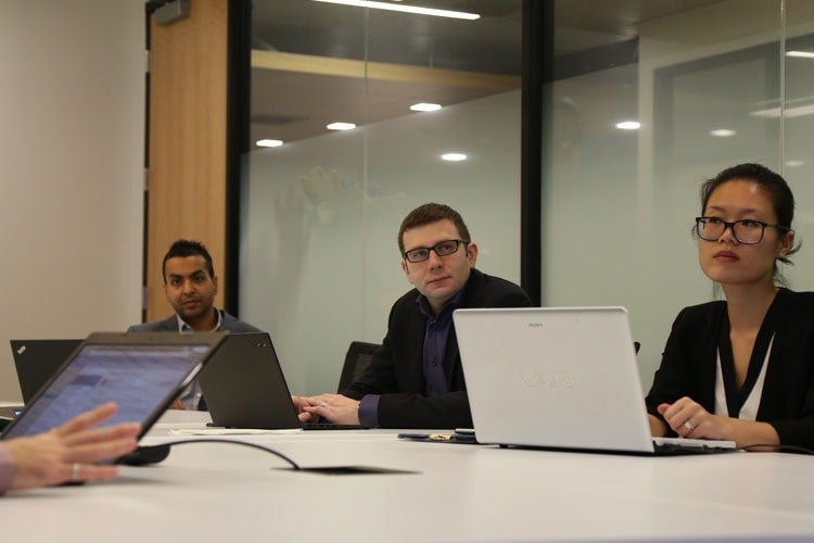 Arif Aziz (left) and Anton Neschadim (centre), both of Rotman's MBA program, and Jessica Yu (right), a PhD candidate in the Institute of Biomaterials & Biomedical Engineering, discuss issues in regenerative medicine commercialization at a team meeting (photo courtesy of Rotman)