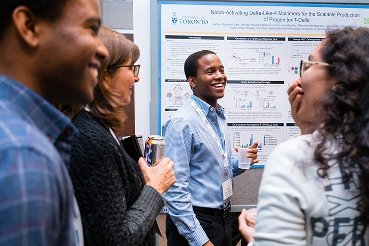 Ashton Trotman-Grant, a PhD student in fundamental immunology in the laboratory of Juan Carlos Zúñiga-Pflücker at Sunnybrook Health Sciences Centre, won the Blueline Therapeutic Translation Award, which recognized the poster with the greatest commercial translation potential. He is developing a cell-free technology that can be used to generate T cells from stem cells to treat cancer patients who become immunodeficient following therapy.