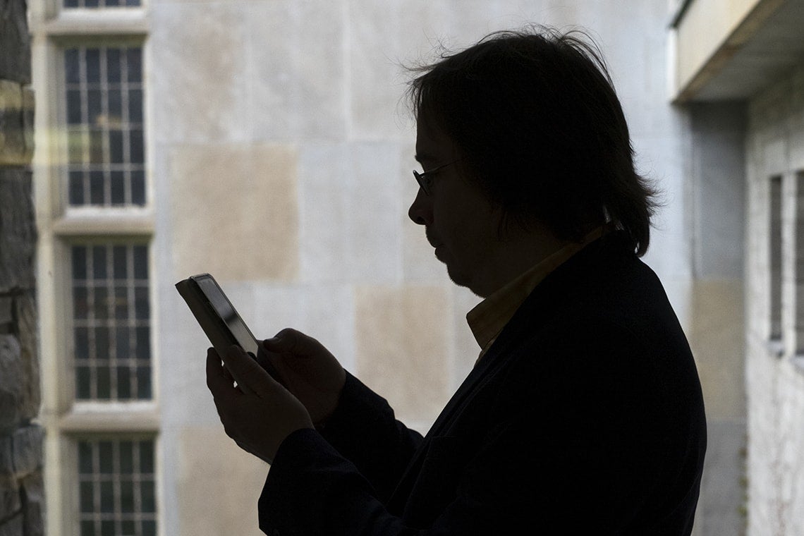 Miller in front of U of T's Gerstein Science and Information Centre (photo by Geoffrey Vendeville)