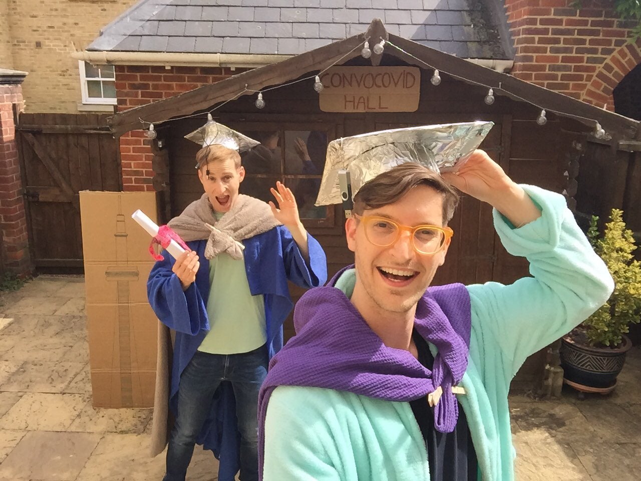 Students, their families and friends on almost every continent tuned into the virtual convocation events and found creative ways to mark the occasion. In June, for example, law students Haim Abraham and Eden Sarid dressed up for the virtual ceremony in imitation regalia of their own design, blue and teal bathrobes with tinfoil mortarboards.