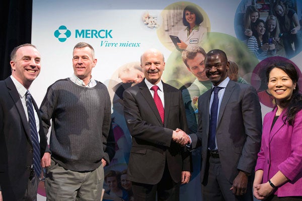 Dr. Ronan O’Hagan, Dr. Aled Edwards, The Honourable Reza Moridi, Mr. Chirfi Guindo and Ms. Jennifer Chan (photo by CNW Group/Merck)