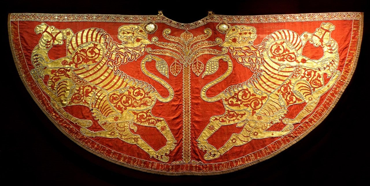 Mantle of Roger II: The precious mantle embroidered with gold, pearls and cloisonné-enamelled plaques was part of the coronation set of robes used at the coronations of the kings and emperors of the Holy Roman Empire. Kaiserliche Schatzkammer, Vienna.