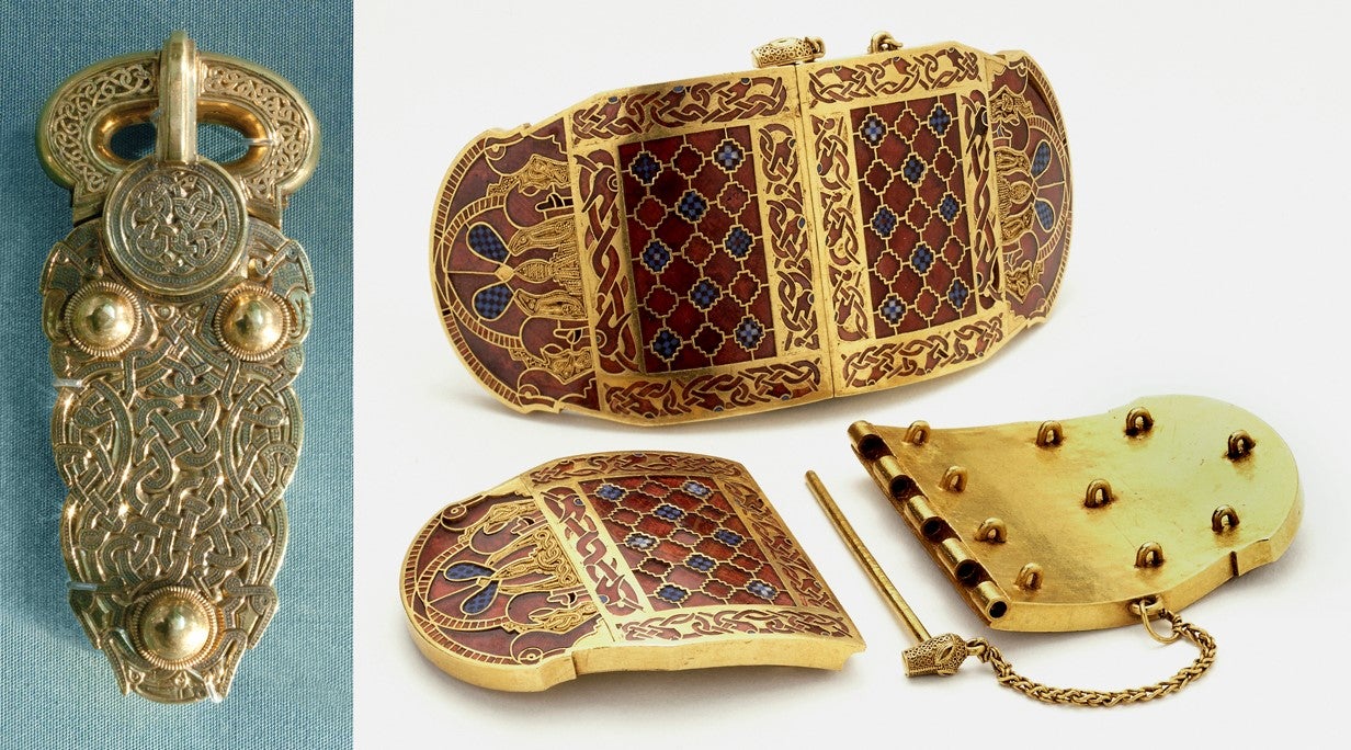 Belt buckle and shoulder clasps, Sutton Hoo, early seventh century. British Museum, London.