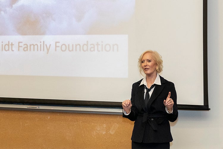 Wendy Schmidt delivers a lecture at a recent U of T School of the Environment event (photo by Justine Apple Photography)
