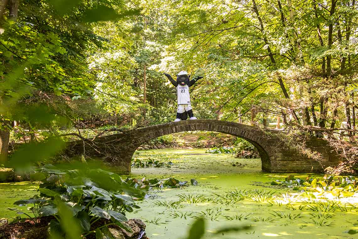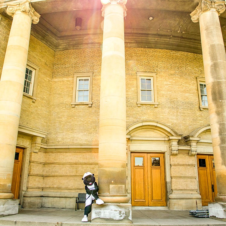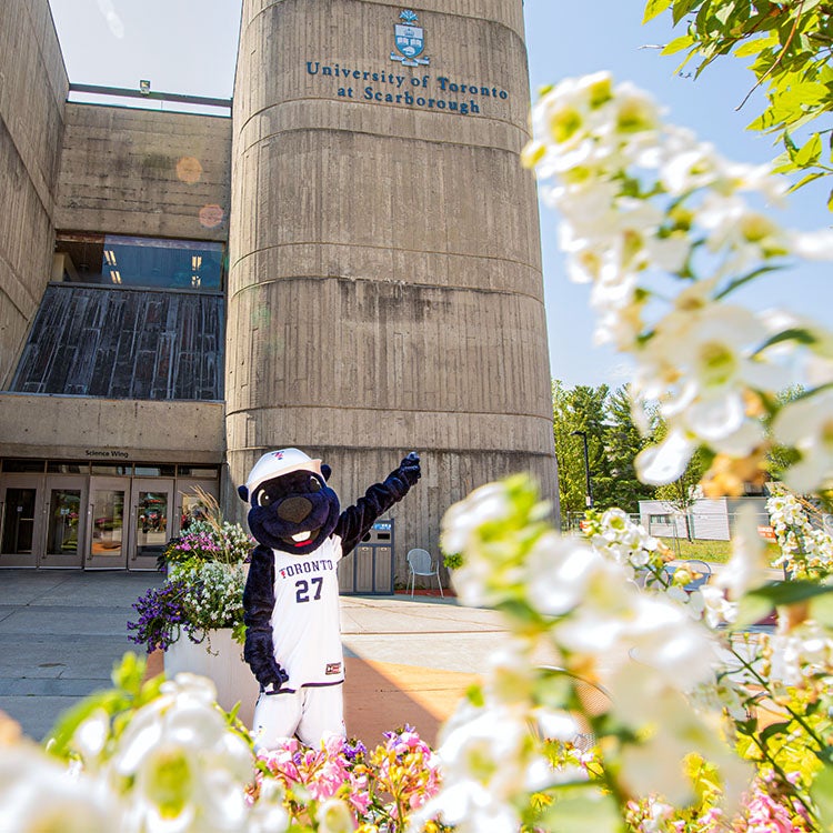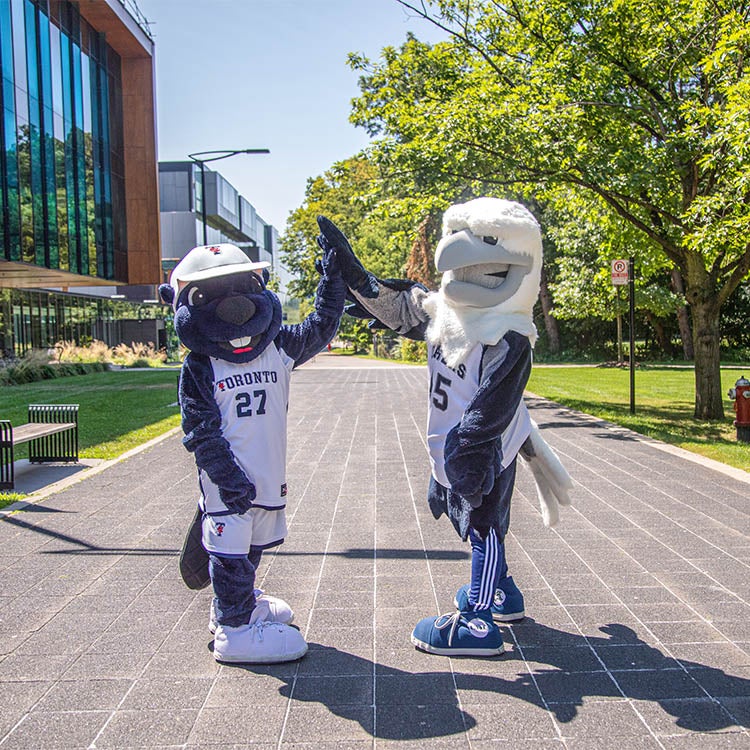 Stroll down U of T Mississauga's Middle Road for the perfect squad photo. (That is the UTM Eagle with True Blue.)