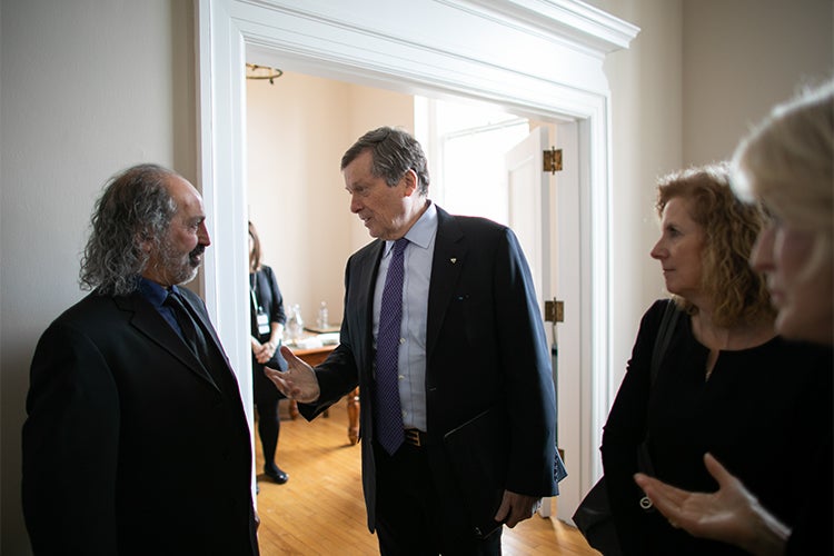 Toronto Mayor John Tory speaks to Mohamad Tavakoli-Targhi, a professor of history and Near and Middle Eastern civilizations at U of T Mississauga, before the ceremony (photo by Nick Iwanyshyn)