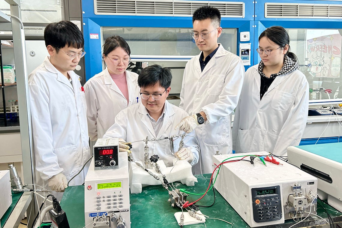 Huazhong University of Science and Technology researchers gather around an electrolyzer to test a new catalyst that can convert CO from captured carbon into acetic acid (photo by Jiayang Song)