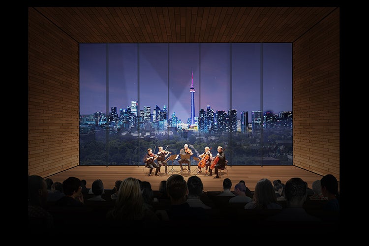 Among the building’s showpieces is a music recital hall, with a large window serving as an exceptional backdrop to the stage and providing the audience with south-facing views of the Toronto skyline. Above the hall will be a 400-seat event space with similar skyline views. There will also be a café on the ground floor and a multi-storey atrium leading up to the recital hall.