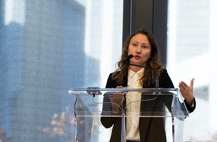 Mariana Khapko, an assistant professor of finance at U of T Scarborough’s department of management, talks about "smart settlement" using blockchain (photo by Chris Sorensen)