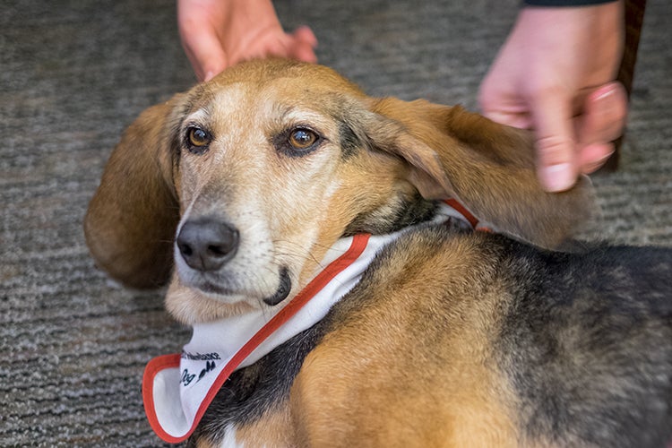 Students play with Bella the therapy dog’s ears at Gerstein library (photo by Geoffrey Vendeville)