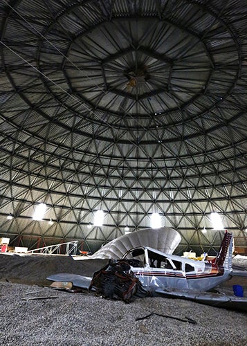 The wreckage of a small private plane rests among debris scattered inside the MarsDome at the University of Toronto Institute for Aerospace Studies (UTIAS).