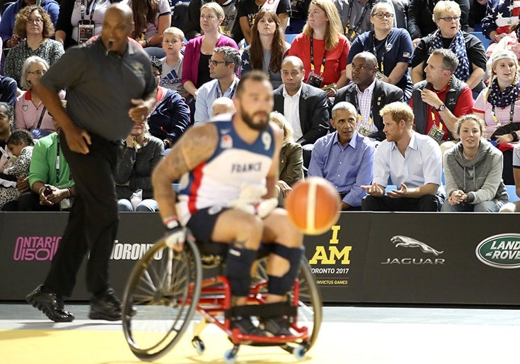 Former U.S. president Barack Obama joined Prince Harry, the founder of the Games, at the Toronto Pan Am Sports Centre to see Team USA take on France in wheelchair basketball.