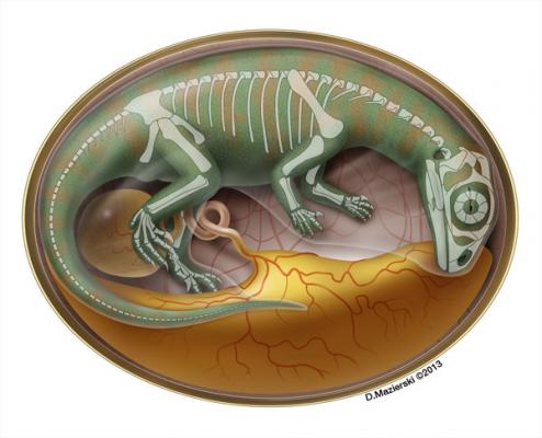 Reisz’s team found that the femurs were being reshaped even as they were in the egg. Examination of the bones’ anatomy and internal structure showed that as they contracted and pulled on the hard bone tissue, the dinosaurs’ muscles played an active role in changing the shape of the developing femur. “This suggests that dinosaurs, like modern birds, moved around inside their eggs,” says Reisz. “It represents the first evidence of such movement in a dinosaur.”