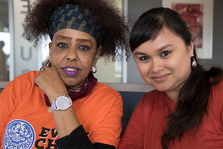 Safia Gahayr, a PhD candidate at OISE, and Ashley Caranto Morford, a PhD candidate in English, show their support for Orange Shirt Day (photo by Hannah James)