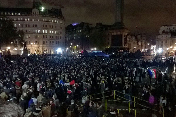 Below, thousands gather in front of the French consulate in Montreal on Nov. 14 (photo by Gerry Lauzon via flickr)