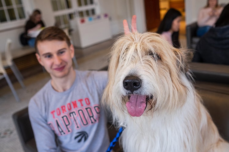 The faculty’s student health and wellness committee put on the event as part of its stress-busting programming. This year, 20 dogs reported for duty and about 200 students got cuddle time with a canine.