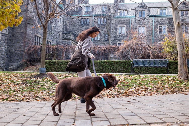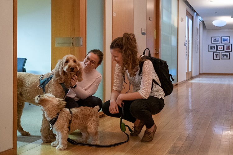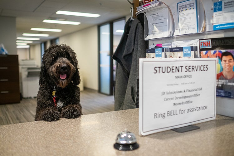Students in the University of Toronto's Faculty of Law recently took a pause from their studies to shake paws on Doggie Day, a twice yearly event held in the spring and fall before exams.