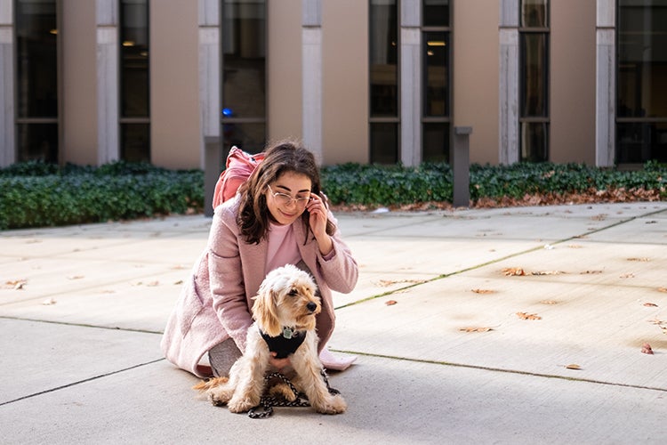 Elsie Tellier, a first-year law student, takes a moment to confer with her client Emmy, a six-month-old cockapoo.