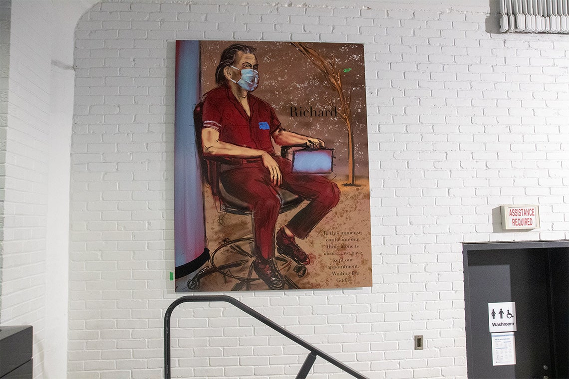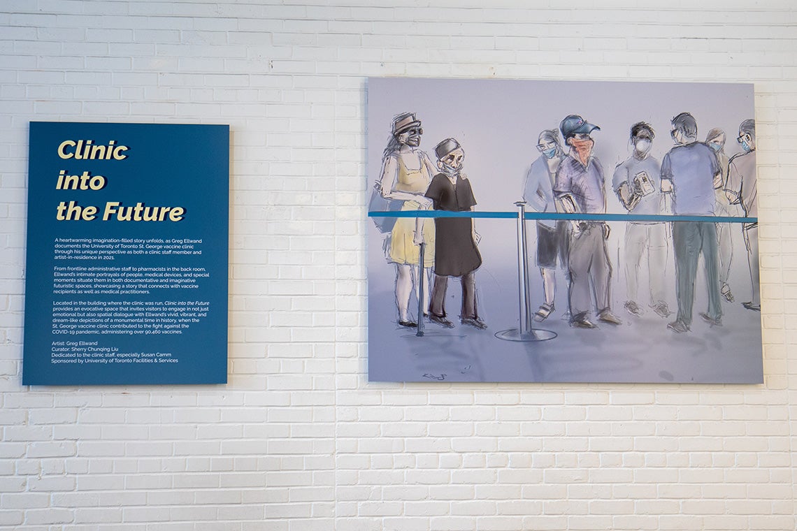 The first painting displayed near the entrance of the Exam Centre – titled Five Questions – depicts the clinic’s check-in area. The exhibit itself, called Clinic into the Future, will be on display indefinitely.