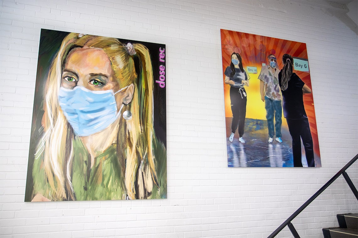 Liu stands in front of the paintings titled All Systems Go and Dreamer Realist, which depict a more vibrant take on the clinic. A quote from Ellwand is painted on the wall above them.