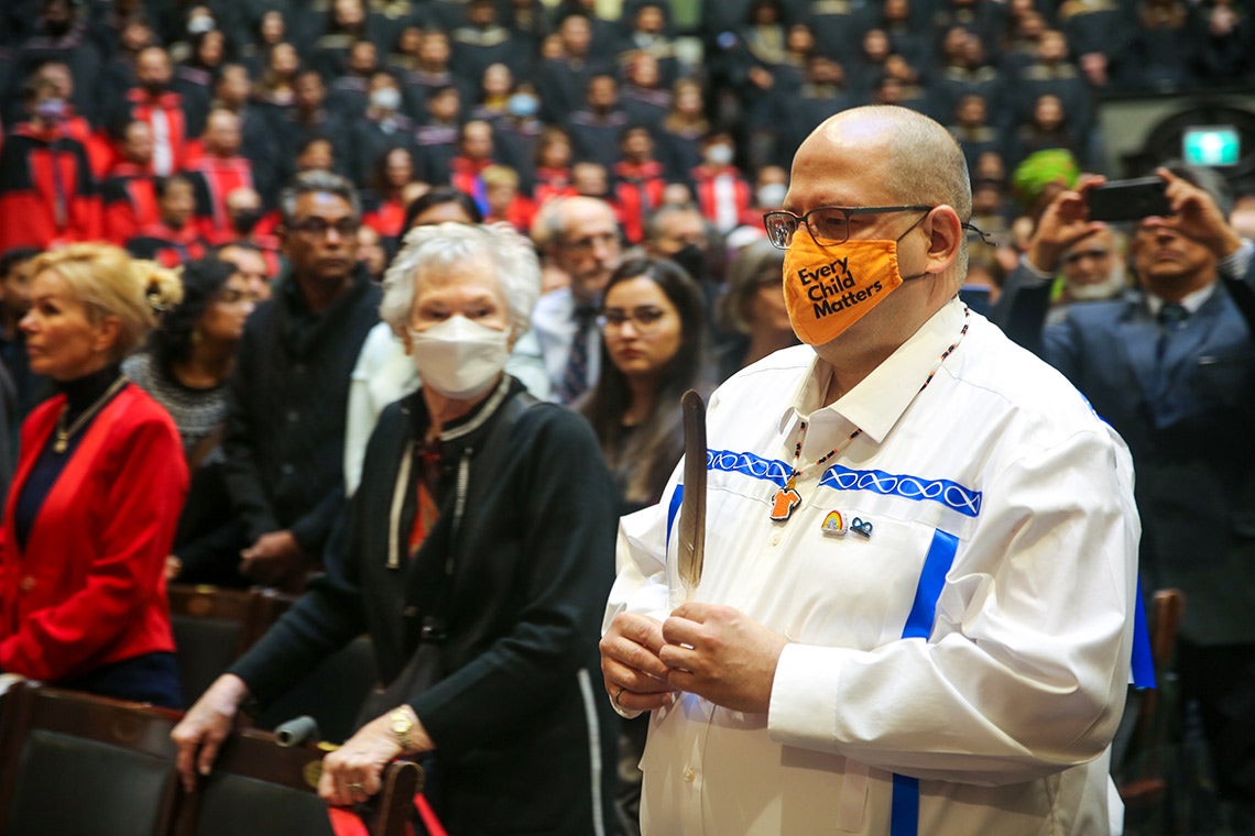 Jason Bazylak, professor, teaching stream, in the department of mechanical and industrial engineering, carries the Eagle Feather during Faculty of Applied Sciences & Engineering celebrations. (Photo by Tristan McGuirk)