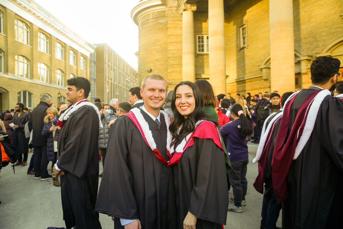 A pair of alumni from the Faculty of Applied Science & Engineering are all smiles at their graduation celebration. (Photo by Tristan McGuirk)