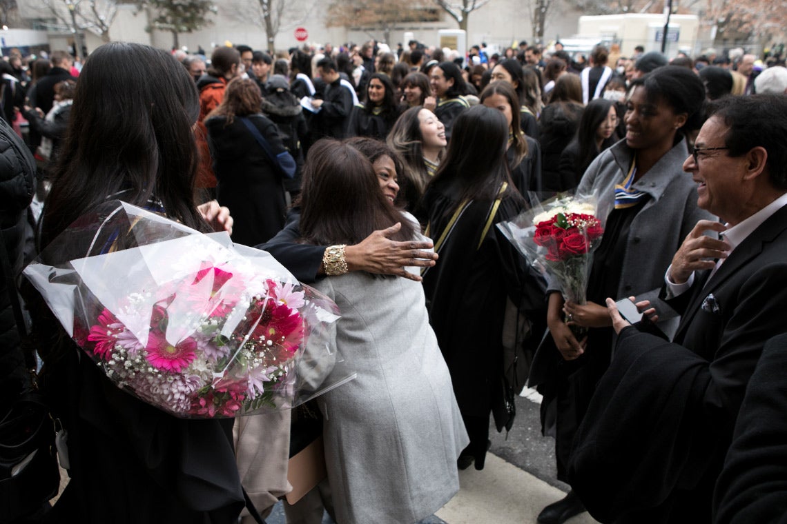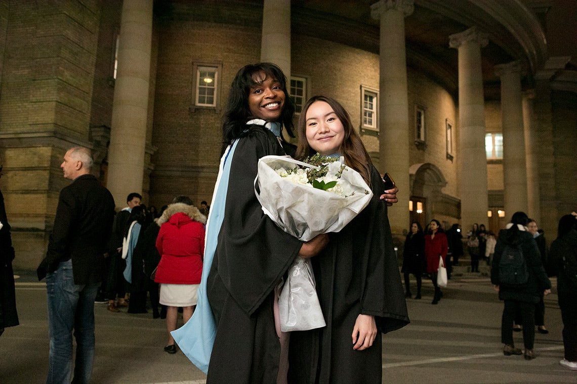 Family and friends embrace outside Convocation Hall at the graduation celebration for the Dalla Lana School of Public Health. (Photo by Dewey Chang)