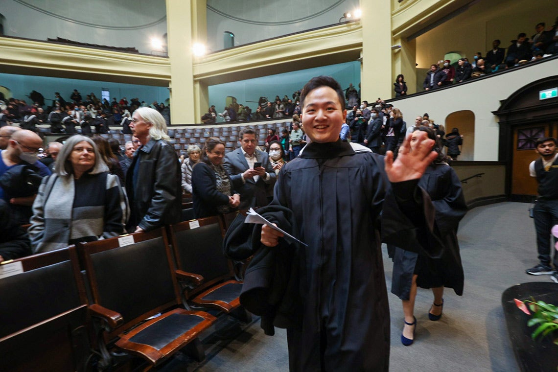 Hey there, grad! An alumnus from the John H. Daniels Faculty of Architecture, Landscape, and Design waves for the camera. (Photo by Harry Choi)
