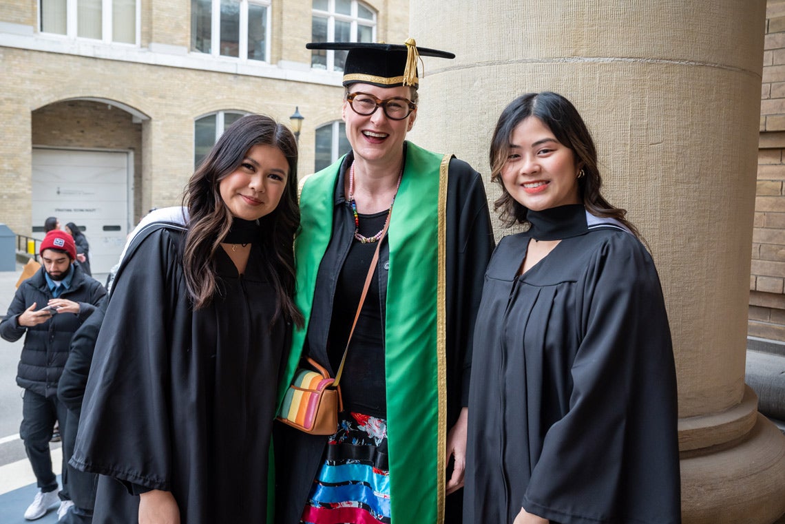 U of T Mississauga grads smile alongside Alexandra Gillespie (centre), U of T vice-president and principal of U of T Mississauga. (Photo by Lisa Sakulensky)